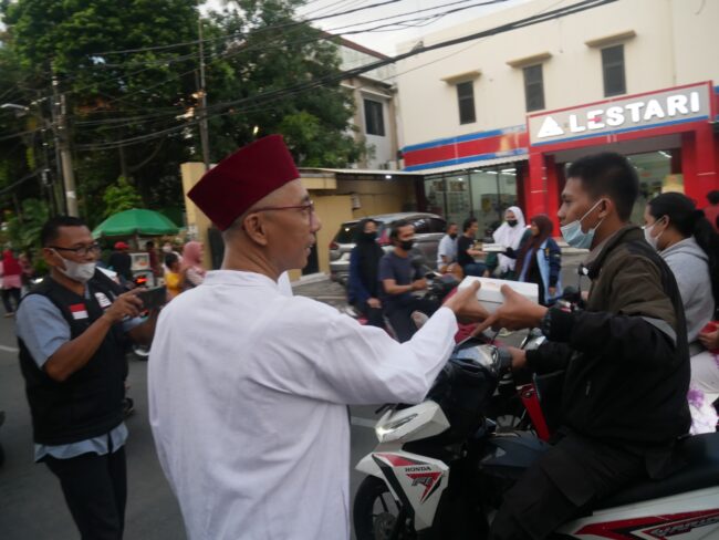 TAKJIL – Ramdansyah Ketua Umum Yayasan (Masjid) Al Mukarromah tengah membagi-bagikan makanan kepada pengendara yang lewat dekat masjid. (Humas Masjid)